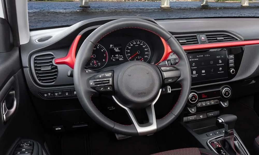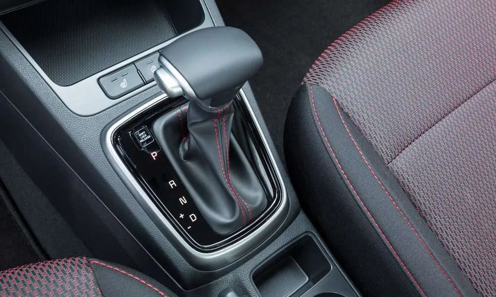 Селектор трансмиссии и рулевое колесо с красной прострочкой